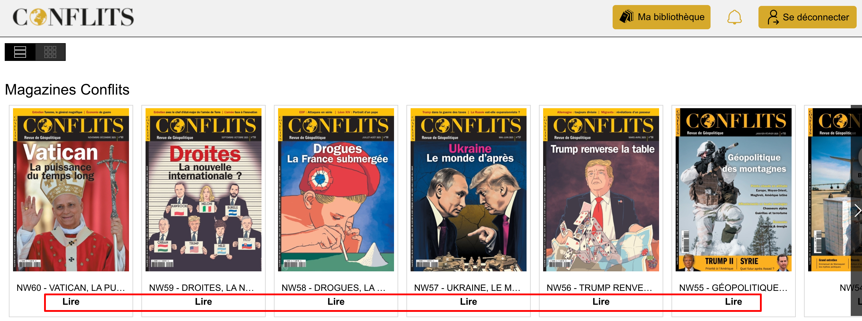 Pour lire le magazine, il faut vous rendre sur la liseuse numérique, accessible aussi depuis le site www.revueconflits.com comme suit :